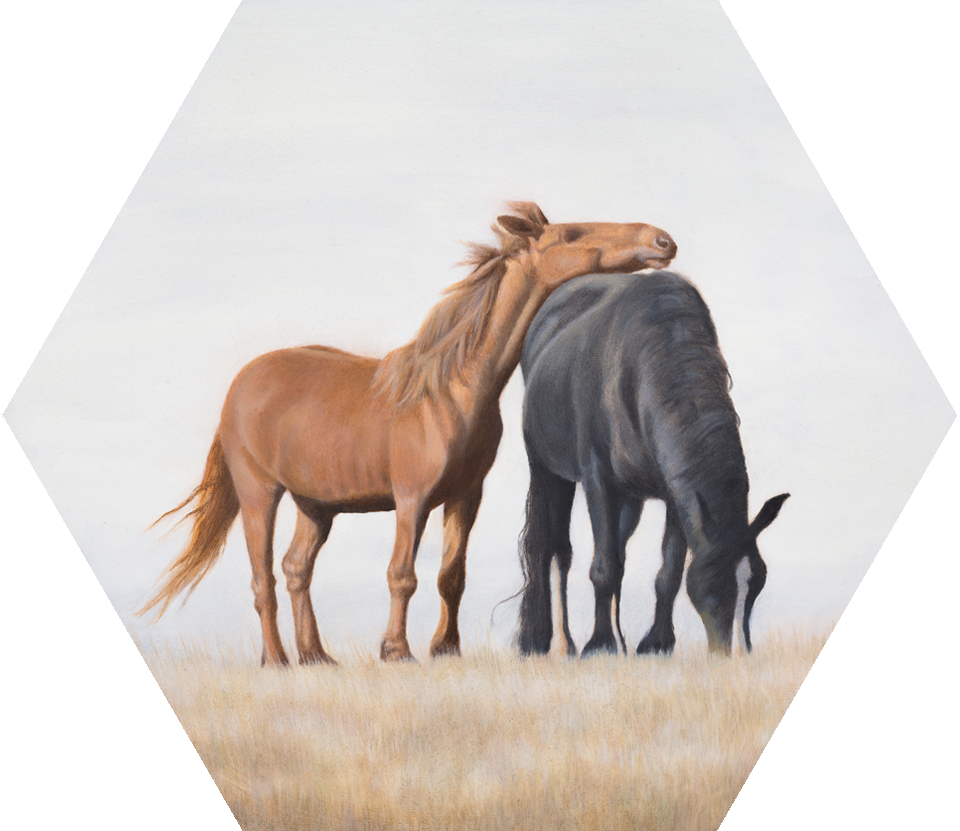 Oil paintings created with natural earth and mineral pigments on frames hand crafted using organic cotton and wood. Each hexagon canvas is approximately 12 x 14". 10% of sales are donated to Big Sky Ranch Animal Sanctuary.